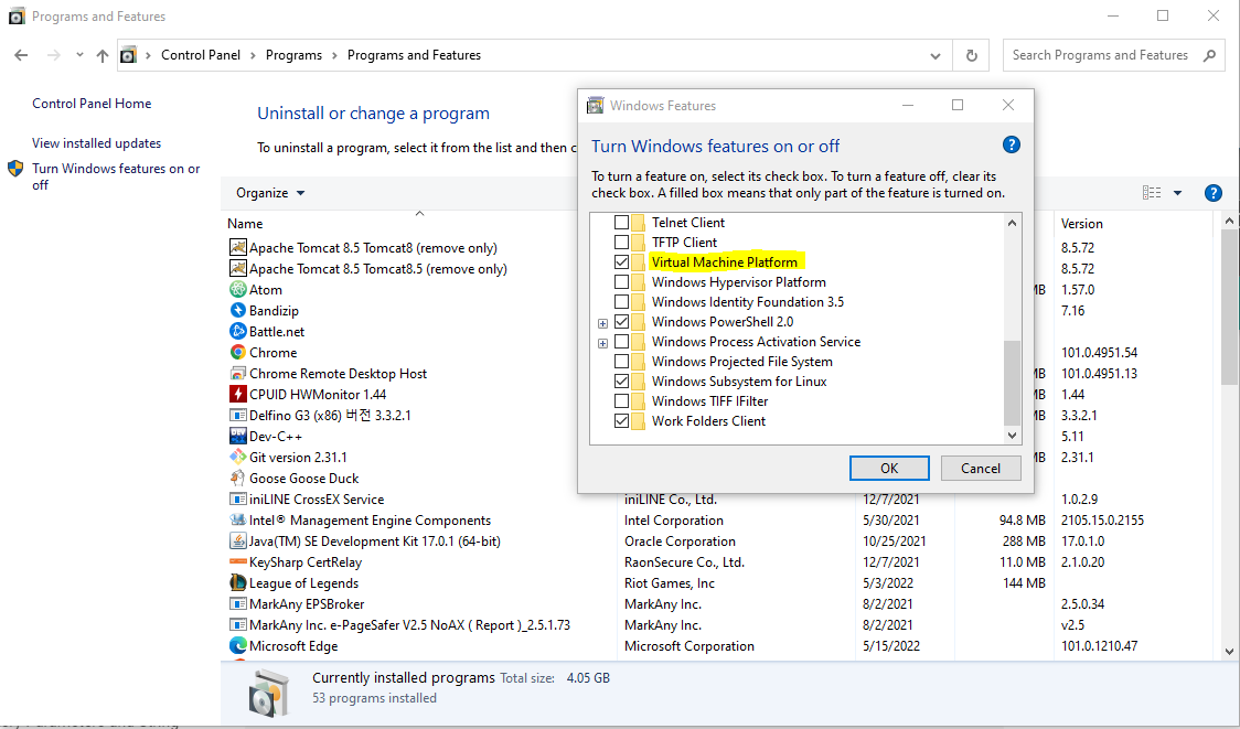 제어판> 프로그램 및 기능 > Linux 용 windows 하위시스템(Virtual Machine Platform) 체크