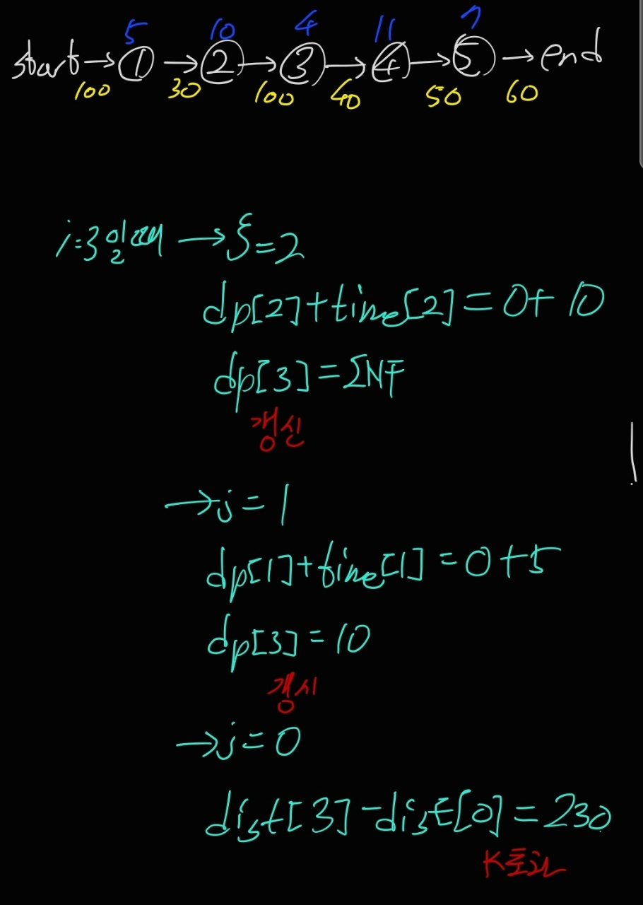 if(dp[i]>dp[j]+time[j]) {//i 까지 가기 위해 j 정류소를 들르는것이 시간이 더 적을 경우